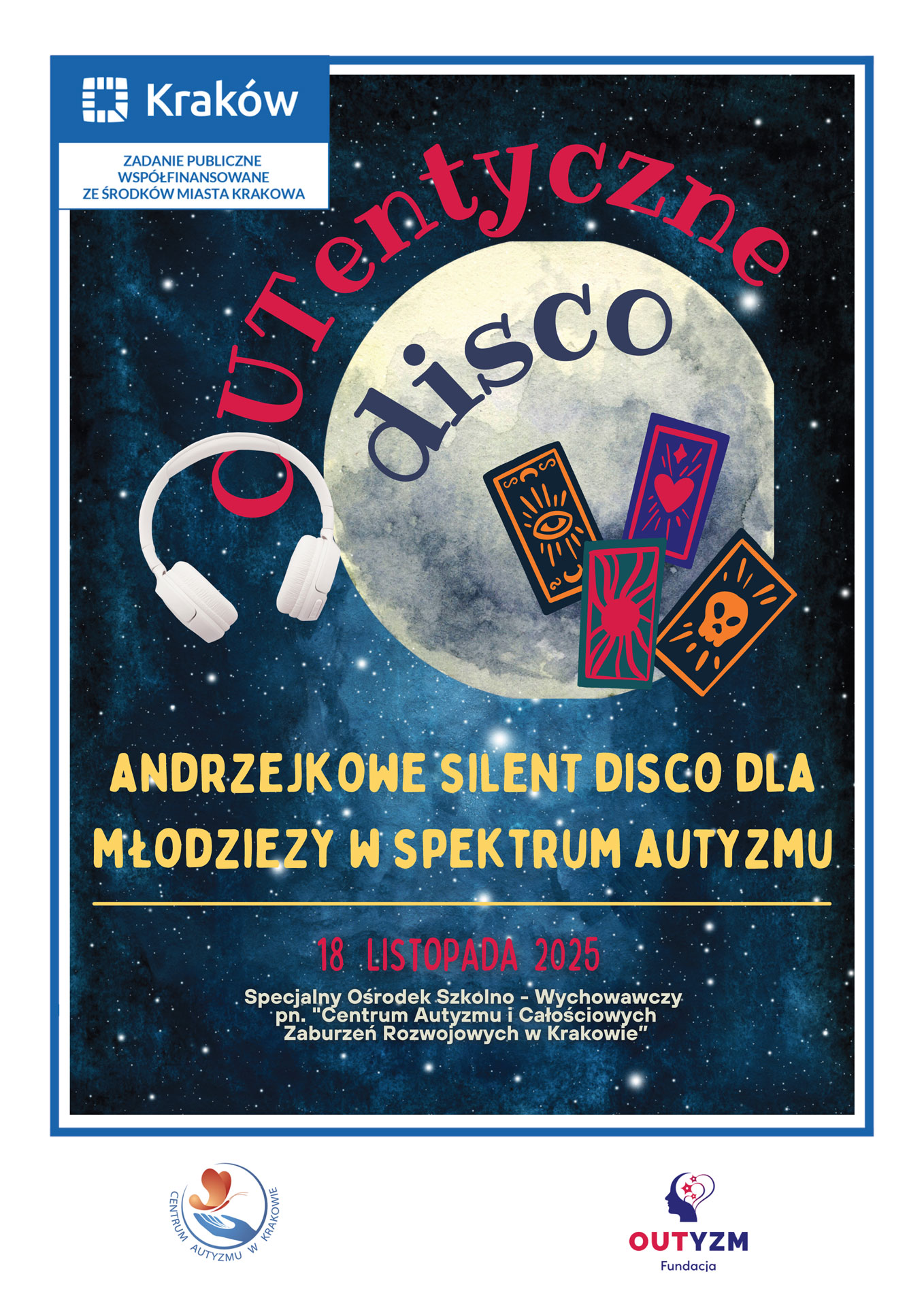 We współpracy z Centrum Autyzmu w Krakowie (dziękujemy😊), oraz dzięki dofinansowaniu ze środków Miasta Krakowa (dziękujemy😊) realizowany jest projekt pn.: OUTentyczne disco – andrzejkowe silent disco dla młodzieży w spektrum autyzmu.